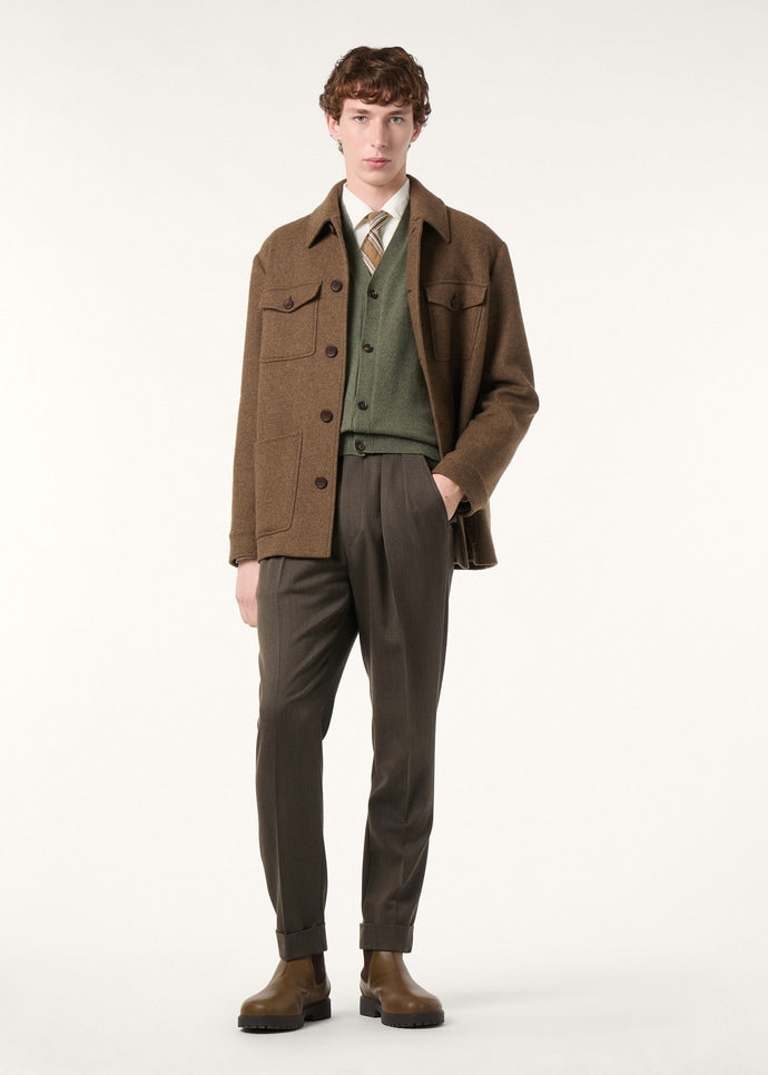 Crafted from a double-layered blend of Wish® wool and cashmere, the Devis Caban is the epitome of warmth and style. It is woven with a subtle herringbone motif, enriched through fulling and brushing to evoke the soft density of Melton felt. The caban silhouette is finished with leather-trimmed interior pockets for a discreet note of sophistication.